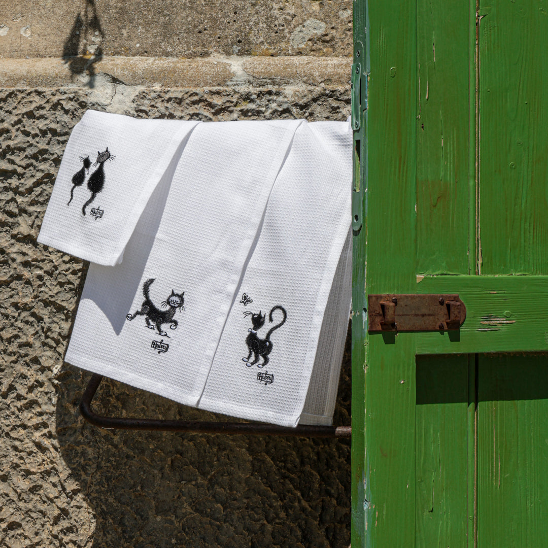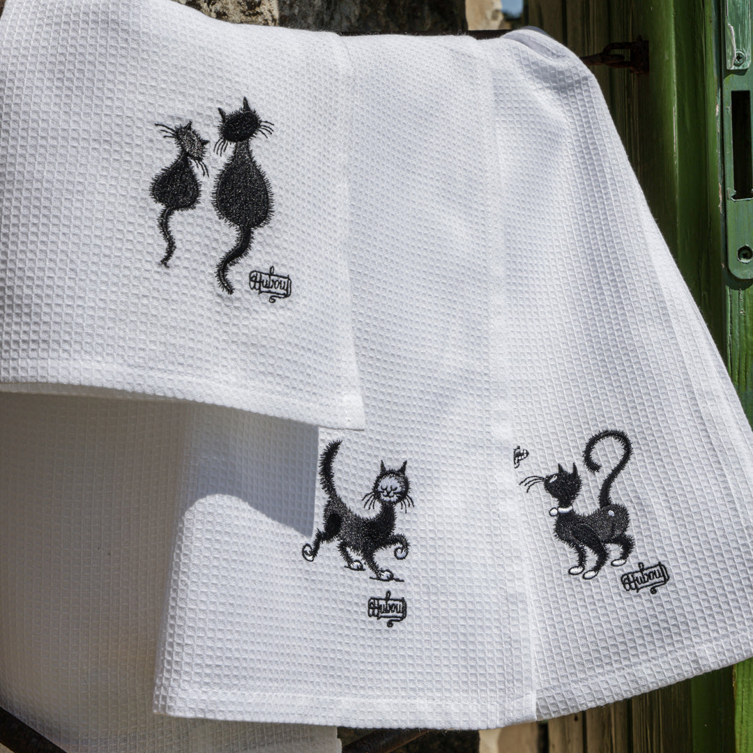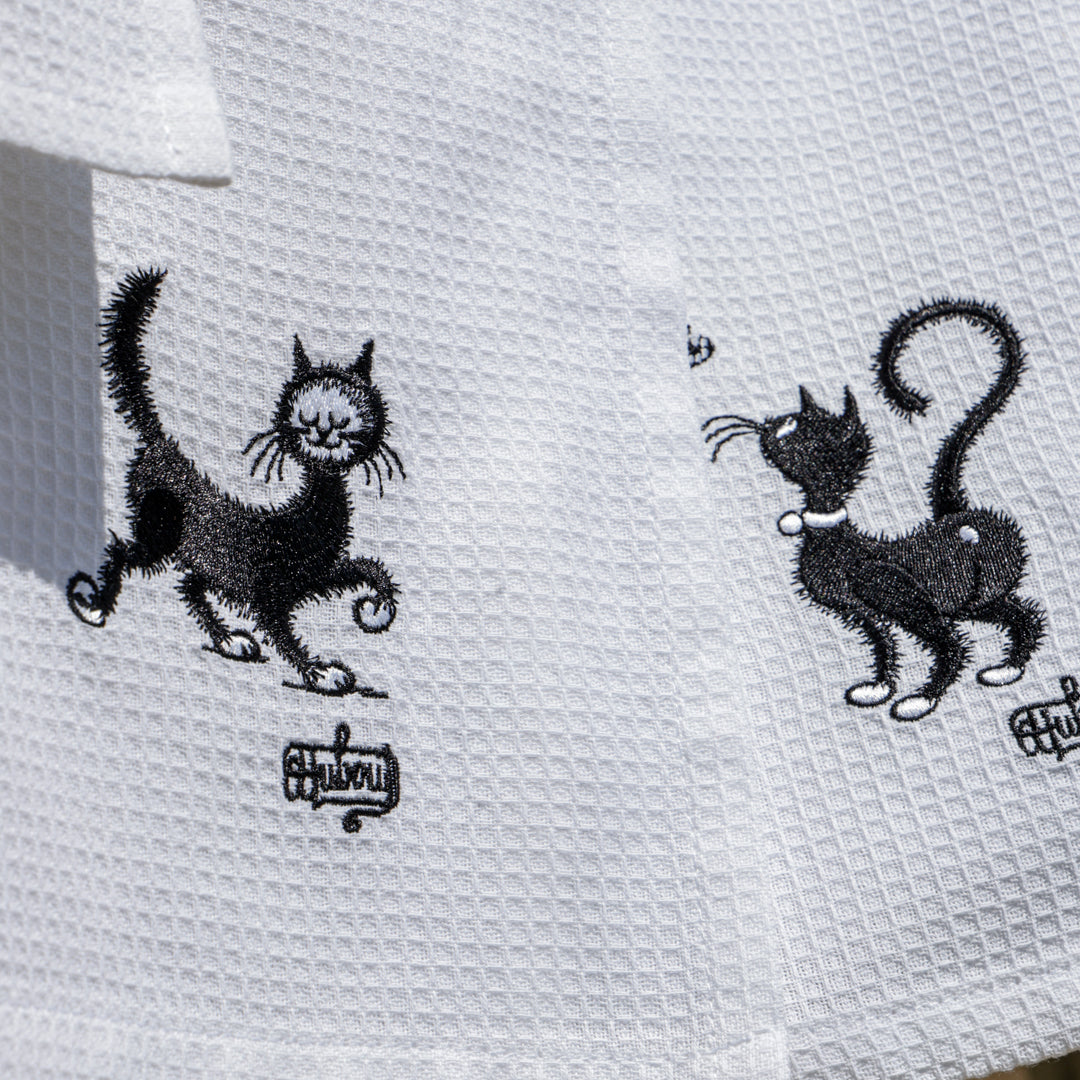 Simpatici e particolari i canovacci con gattini. Realizzati in un pratico e assorbente cotone garzato bianco, ricamato con gattini neri, differenti su ognuno dei tre canovacci. Rifiniti sui 4 lati con un resistente punto lineare. Pratico gancio su angolo interno per essere comodamente appesi nella vostra cucina. Un tocco di originalità e simpatia tra i vostri fornelli!