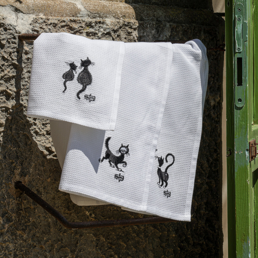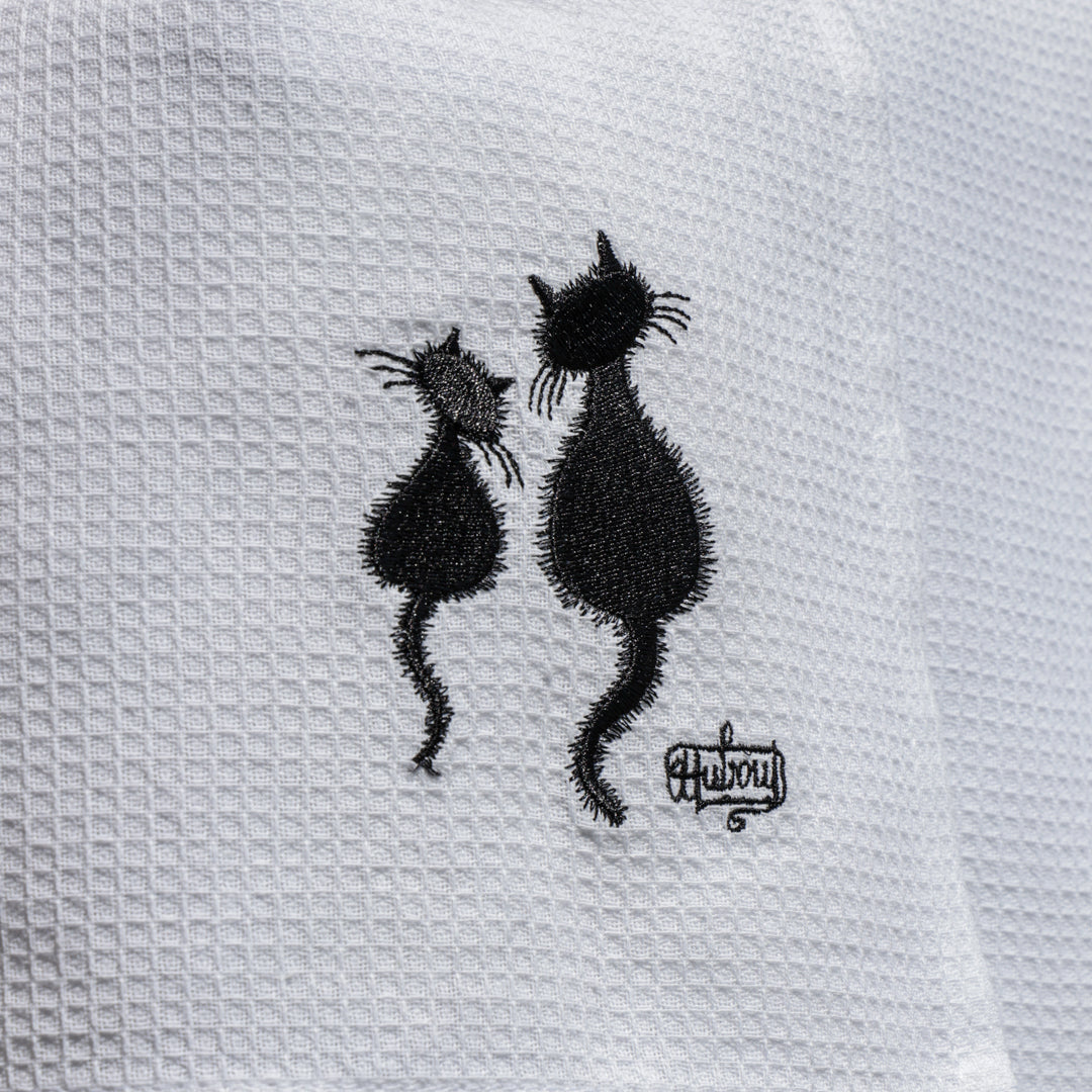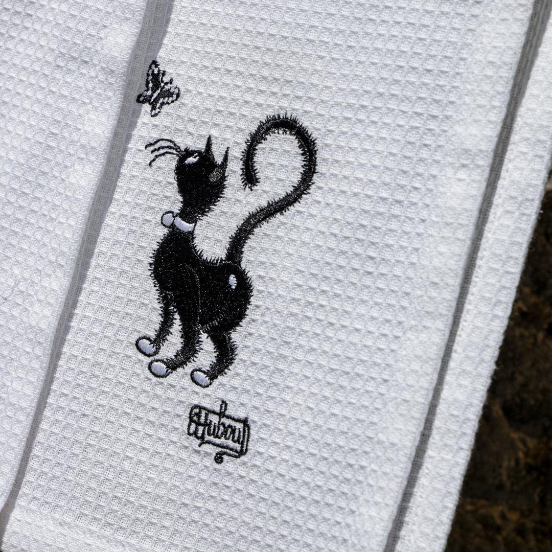 Simpatici e particolari i canovacci con gattini. Realizzati in un pratico e assorbente cotone garzato bianco, ricamato con gattini neri, differenti su ognuno dei tre canovacci. Rifiniti sui 4 lati con un resistente punto lineare. Pratico gancio su angolo interno per essere comodamente appesi nella vostra cucina. Un tocco di originalità e simpatia tra i vostri fornelli!