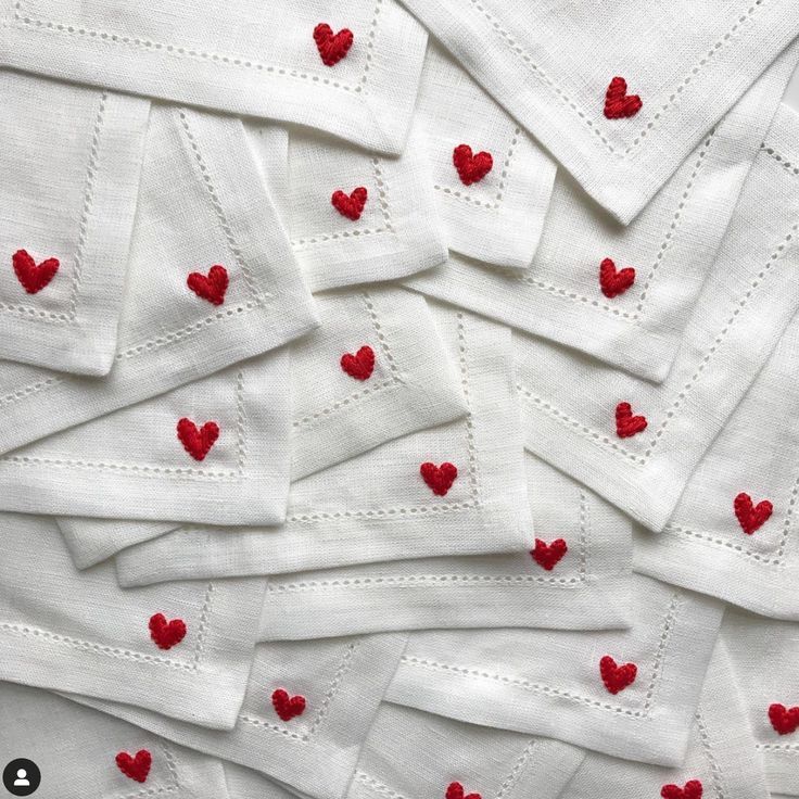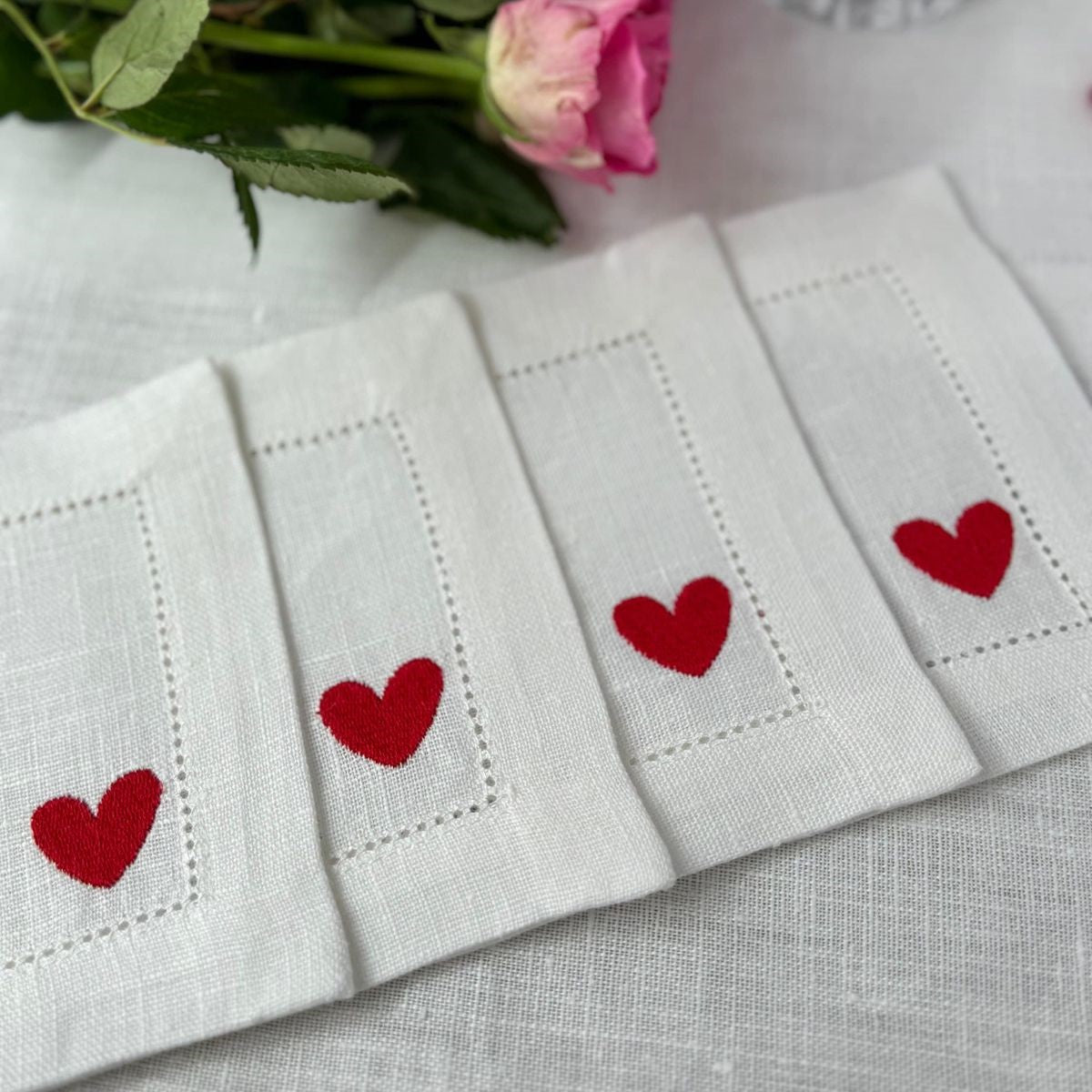 Eleganti e insoliti sottobicchieri in puro lino con ricamo cuore, simbolo di amore e attenzione per i piccoli gesti.