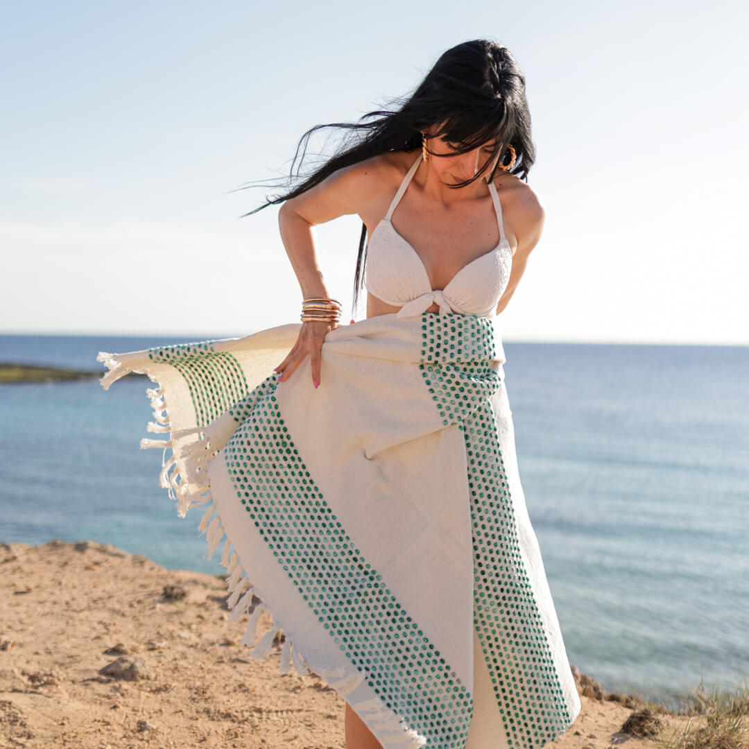 I due lati corti sono rifiniti con una frangia in cotone impreziosita da piccoli fiocchetti, che conferisce movimento e un aspetto fresco e raffinato, perfetto per le giornate al mare o in piscina.