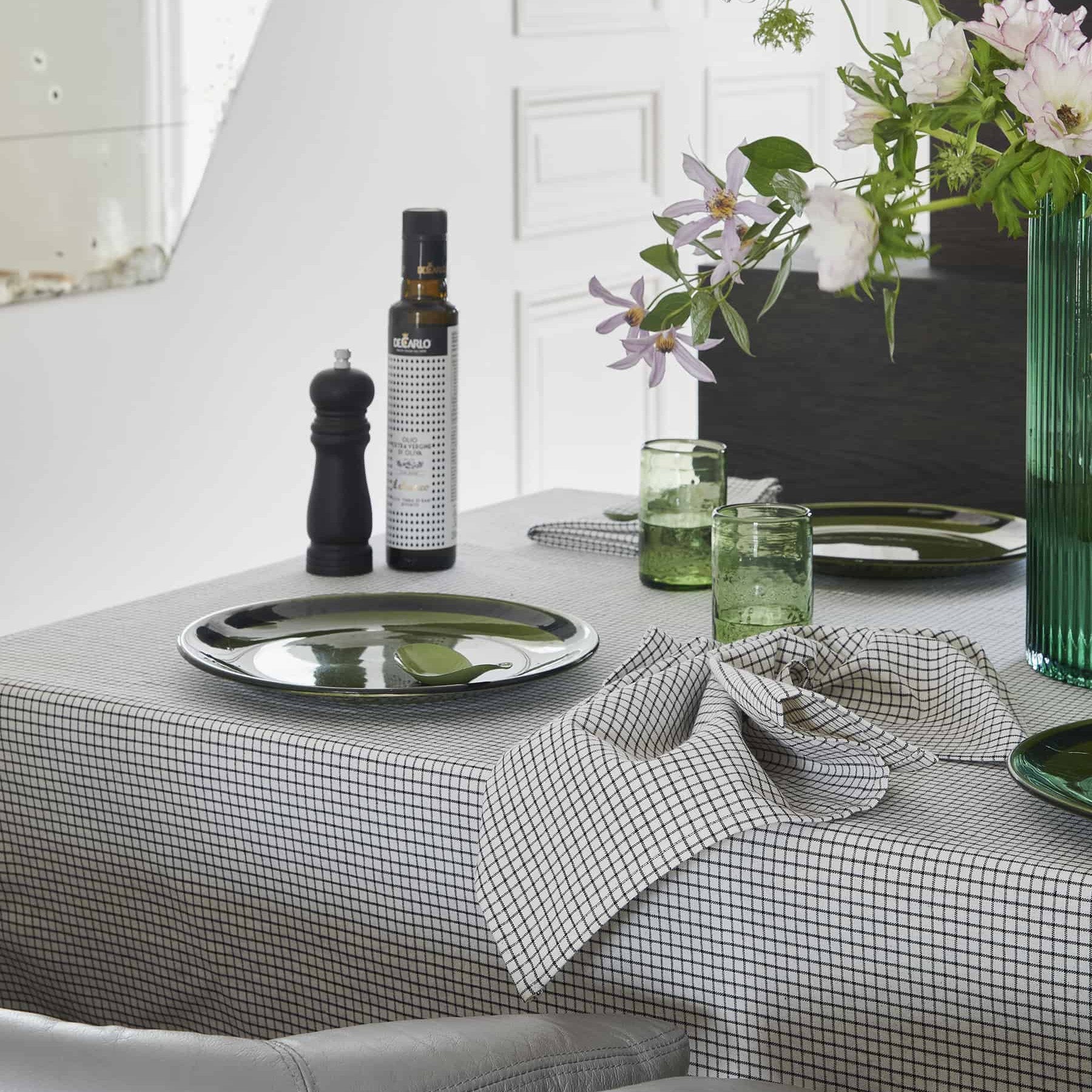 Realizzata in tessuto di cotone con base bianca e motivo scozzese nero, questa tovaglia è perfetta per donare un tocco di eleganza rustica e senza tempo alla tua tavola.